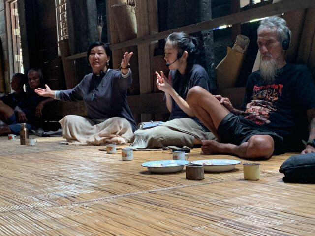 Chomti and ten other international delegates have recently arrived from their home territories, traveling up to three days to gather at this storied river’s edge. He is joined by his Hin Lad Nai colleague Aphichai Khacha; byTsewang Bista and Ashoka Pariyar from the Lhoba Indigenous Community of Nepal and NEFIN (Nepal Federation of indigenous Nationalities); World Union of Indigenous Spiritual Practitioners (WUISP) representatives Altantsetseg Tsedendamba from Arga Bilig, Mongolia, and Kuluipa Akmatova from the Kushchu and Tashtanbek clans of the Kyrgyz People; from the Philippines, Valeree Nolasco and Luchie Maranan (Tagalog) of Nia Tero and Pawanka Fund, respectively; and from the Indonesian Indigenous organization AMAN (Aliansi Masyarakat Adat Nusantara), Feri Nur Octaviani (Javanese). Several interpreters and support staff are also assisting with this unique regionally focused Indigenous exchange.